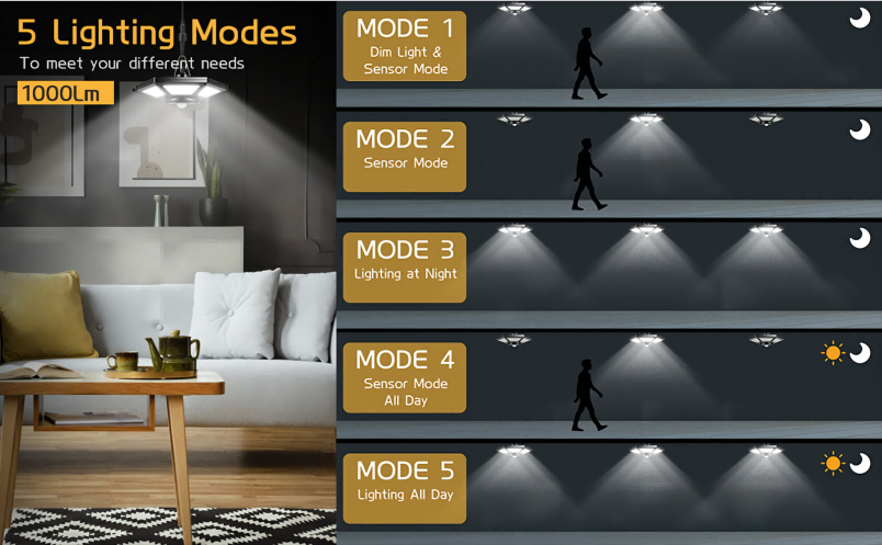 OGoleuadau sied synhwyrydd symudiad solar awyr agored gyda 5 modd goleuo.