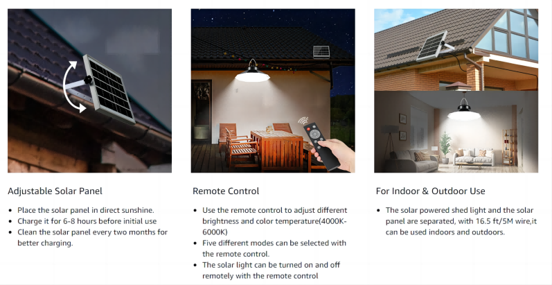3. Gosodiad Diddos a Hawdd IP65 Mae golau gwrth-ddŵr awyr agored goleuadau ysgubor solar yn dod gyda dyluniad gwrth-ddŵr IP65 ac mae wedi'i gysylltu â'r panel solar gyda chebl 16.4 troedfedd.
